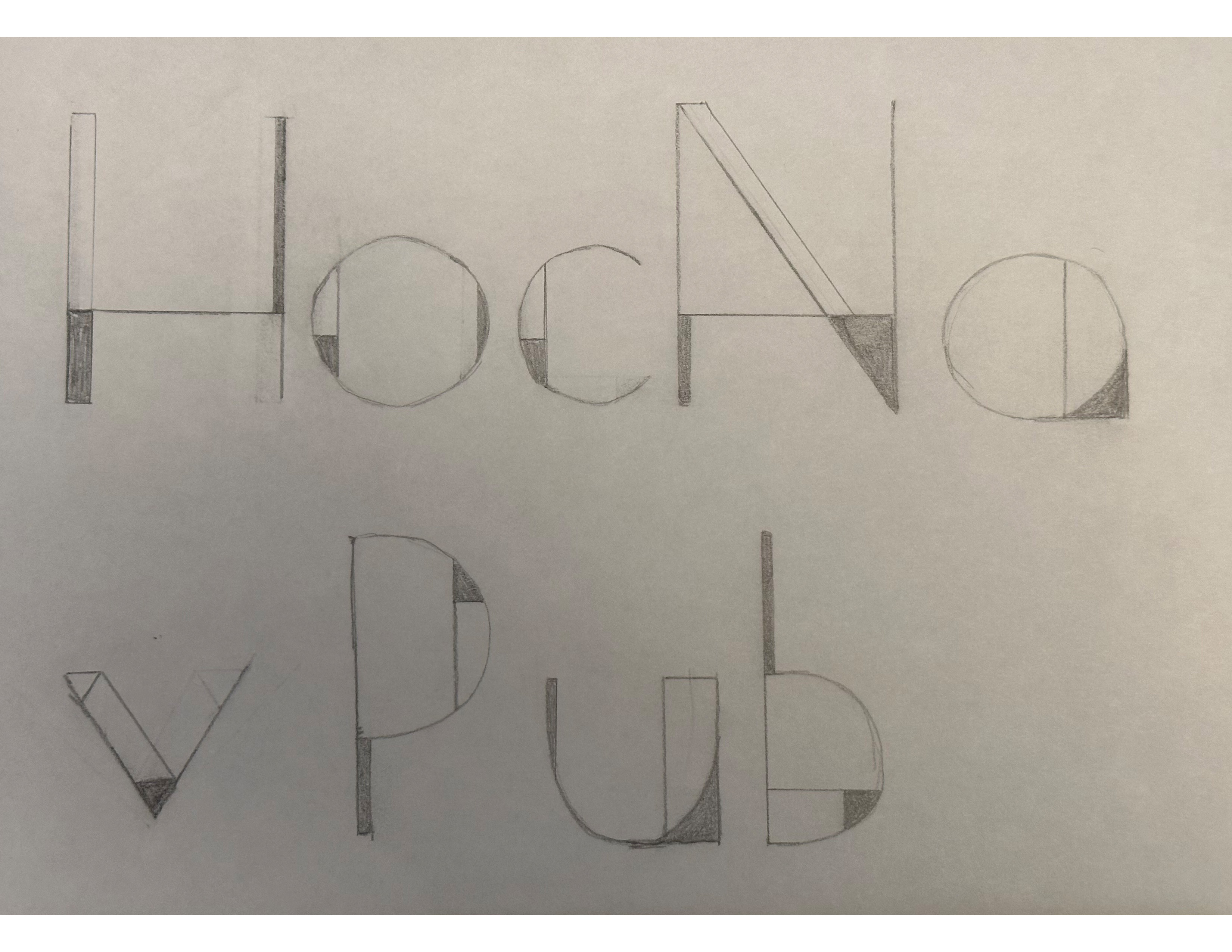 I am currently working on completing a typeface of my own creation. I have begun by creating a "HocNavPub" design as well as some additional letters that are utilized in mock up designs for the typeface.
